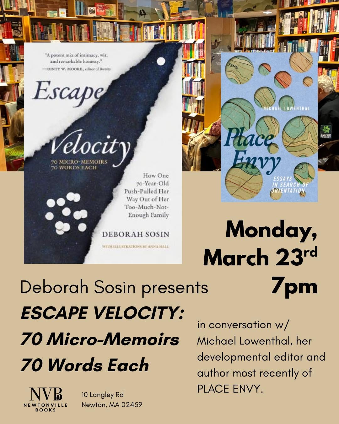 Monday, March 23, 7 pm, in-person launch event at Newtonville Books, Newton, Mass., in conversation with Michael Lowenthal, author of Place Envy (gotta love the poster below).